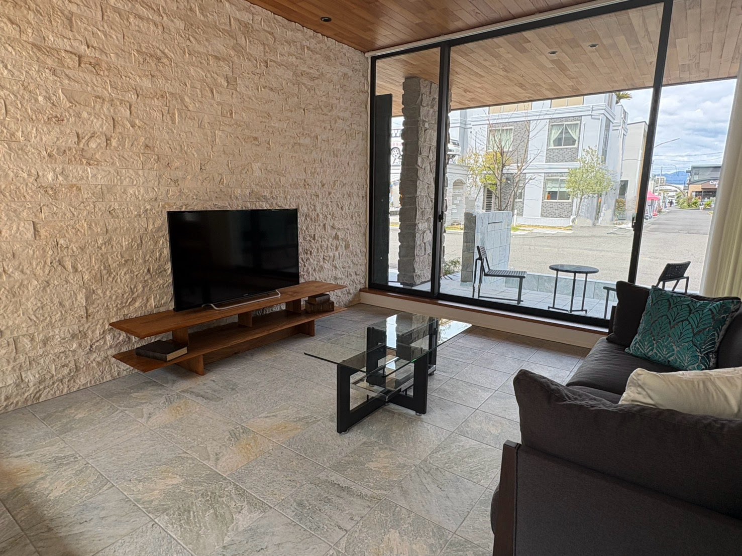 • リビングの壁面は石貼り、フロアダウンの床材にはタイルを使用し素材感を感じられる空間が広がっています。